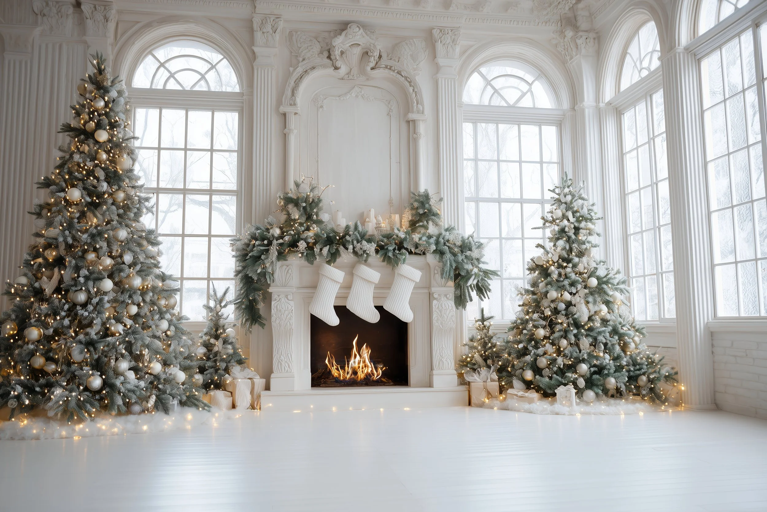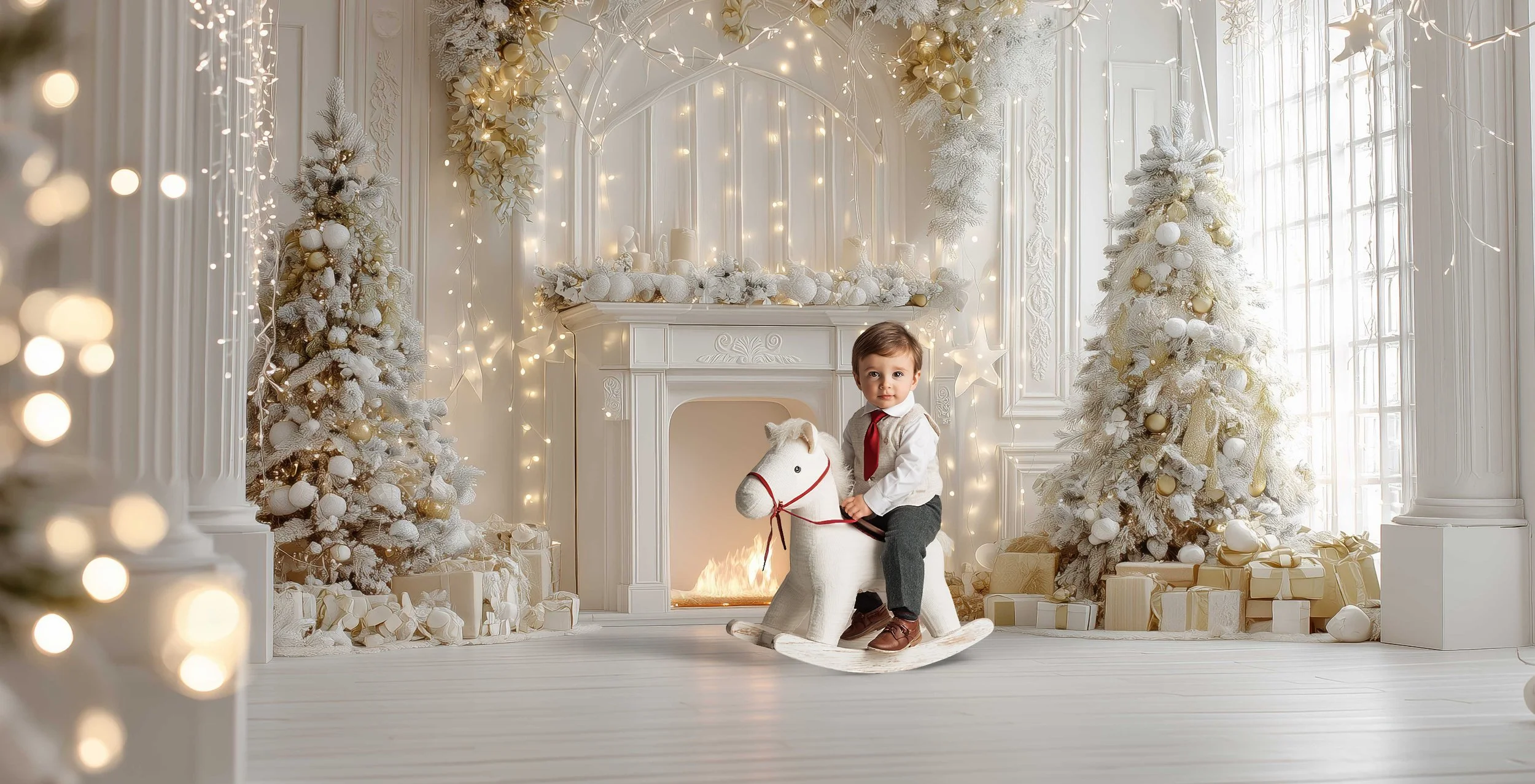 Red barn digital christmas backdrop with decorated christmas trees and holiday lights, red barn doors - 4 different backgrounds included
